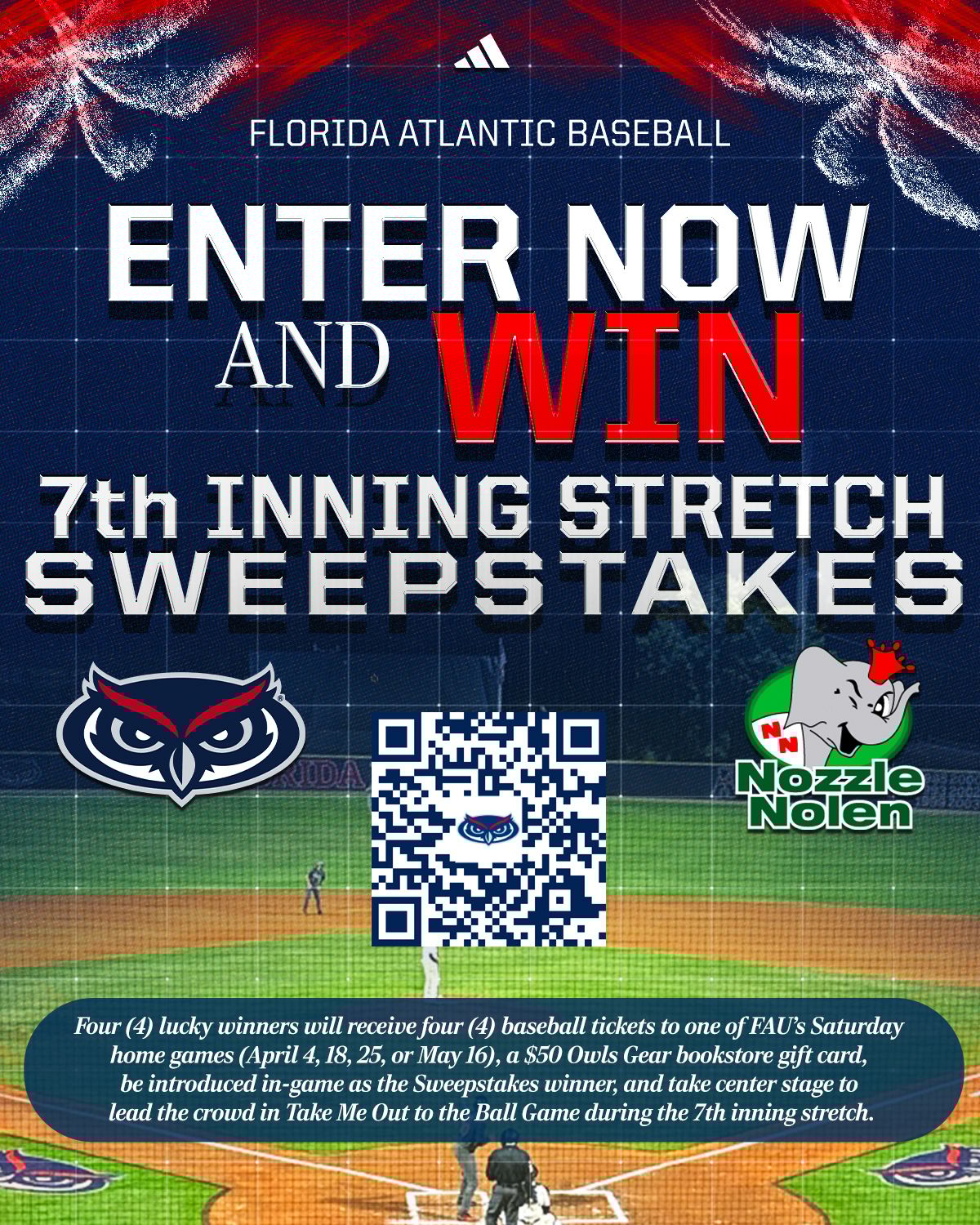 Florida Atlantic Owls fans! Enter the 7th Inning Stretch Sweepstakes presented by Nozzle Nolen for a chance to win big at the ballpark! Four (4) lucky winners will receive four (4) baseball tickets to one of FAU’s Saturday home games (April 4, 18, 25, or May 16), a $50 Owls Gear bookstore gift card, be introduced in-game as the Sweepstakes winner, and take center stage to lead the crowd in Take Me Out to the Ball Game during the 7th inning stretch.