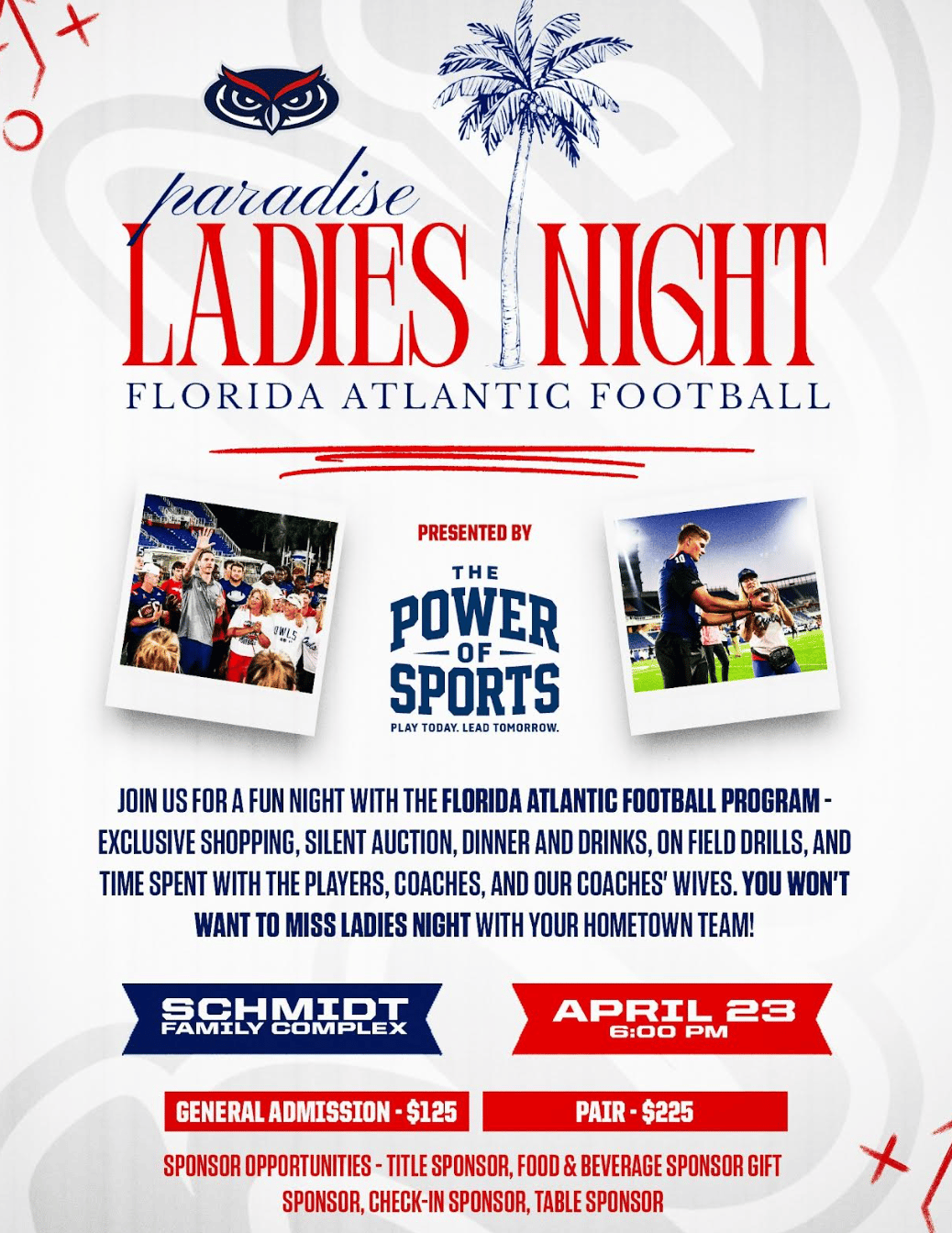 We’re excited for the 3rd annual Ladies Night presented by The Power of Sports, an exclusive evening with Florida Atlantic Football on Thursday, April 23rd, 2026 from 6:00 PM - 9:00 PM!