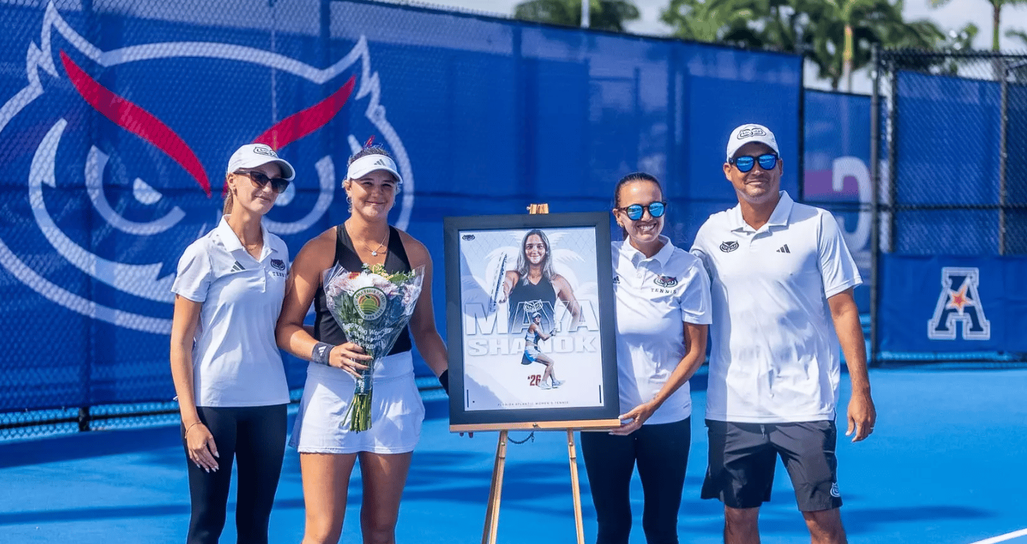 🔼 On Senior Day. The Owls celebrated four-year senior Maya Shanok and then gutted out a thrilling 4-3 win over Tulane at the Strauss Tennis Center. FAU grabbed the doubles point behind wins from No. 68 nationally ranked Panna Bartha/Katrin Pavkova and Rowinska/Shanok. Freshman Malika Amirgaliyeva cruised on court three and Pavkova won in straights on court four, but Tulane fought back to knot things at 3-3. It came down to Alexia Patru on court five, who won a dramatic third-set tiebreak 7-0 after splitting the first two sets, clinching the match 6-4, 1-6, 7-6(0). FAU closes the regular season at FIU on April 11.